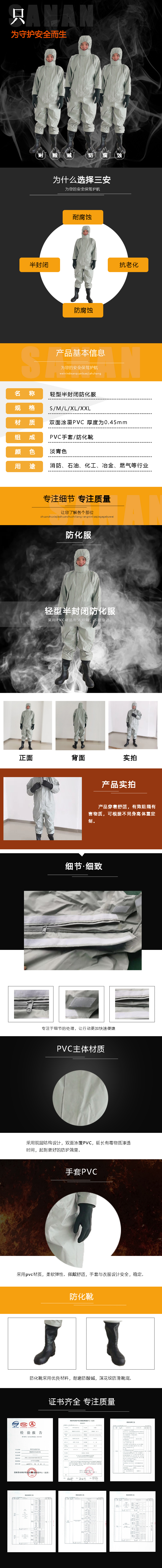 0531-66586878輕型半封閉-淡青色款:半封閉防護(hù)服又叫阻燃化學(xué)防護(hù)服,防酸堿服,消防防化服,是工作人員在有危險性化學(xué)物品或腐蝕性物品的現(xiàn)場作業(yè)時,為保護(hù)自身免遭化學(xué)危險品或腐蝕性物資的侵害而穿著的防護(hù)服。